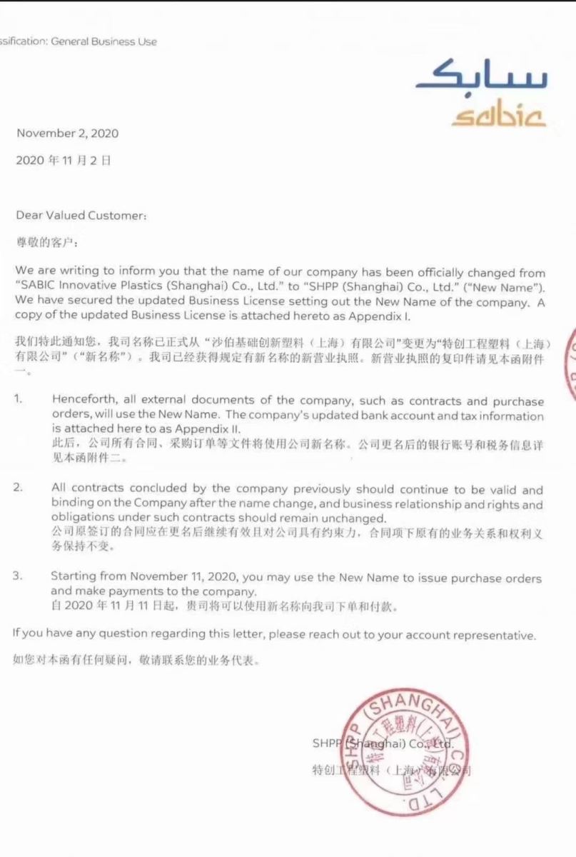我們特此通知您,我司名稱已正式從“沙伯基礎創新塑料(上海)有限公司"變更為"特創工程塑料(上海)有限公司”(“新名稱”),我司已經獲得規定有新名稱的新營業執照。新營業執照的復印件請見本函附件一。